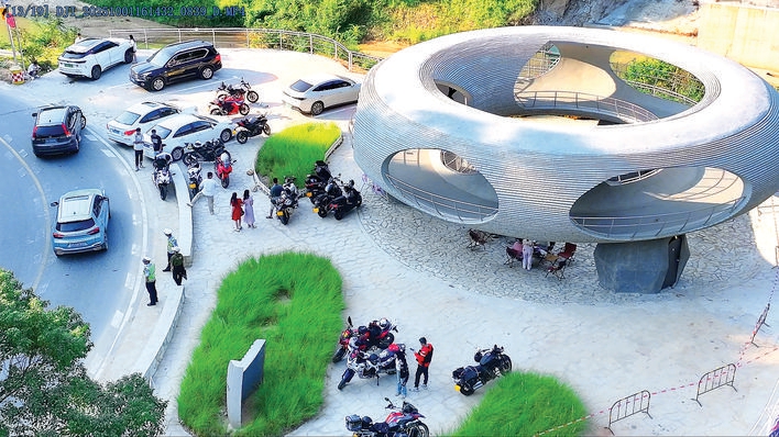 218最美旅游公路沿途設置的藝術裝置,既是網紅打卡點,也是游人休憩的好去處。在博羅段中,綠屏石灘藝術裝置尤為吸睛。直徑16.5米的觀景環凌空懸于峭壁邊緣,下沉廣場與漂浮平臺構成的雙層標高景框,恰好將山水風光框成一幅流動的畫,成為游客定格美景的絕佳選擇。休憩區里,摩旅愛好者與騎行愛好者圍坐閑談,手捧特色豆花拿鐵,你一言我一語分享著沿途所見的秀麗風光。“一路風景絕了!各個驛站和藝術裝置的間距特別合理,騎累了就坐下喝杯咖啡、看看山景,這種邊騎邊玩的愜意,是其他路線比不了的。”騎行愛好者鄧先生贊不絕口。他說,騎行群里常有人分享這條公路的美景與攻略,趁著國慶假期,他立刻約上好友來一場深度體驗。羅浮山茶、東坡茶樂事等本地特色飲品,剛推出就成了游客爭先品嘗的“爆款”。