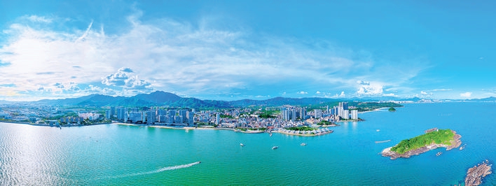 大亞灣霞涌悠長蜿蜒的海岸線上,海水似翡翠般澄澈透亮,波光粼粼,與澄澈藍天、悠悠白云遙相呼應;岸邊,高樓錯落分布,和遠處青翠山巒相互映襯,勾勒出獨特的城市與自然交融之景。