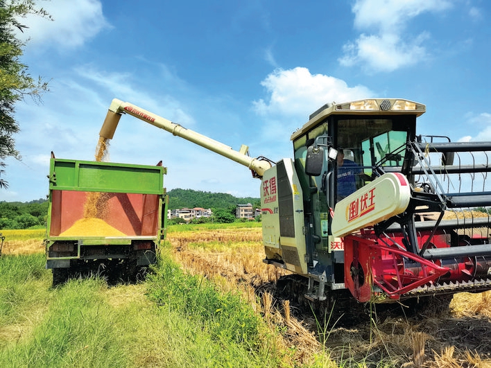采訪當天,烈日高懸。農民正抓緊晴好天氣在田間收割水稻。在橫瀝鎮洋圳村種糧大戶鄭松貴的稻田,記者看到沉甸甸的稻穗彎了腰,鄭松貴開著收割機,在田間來回穿梭。不久,一大片黃澄澄的水稻田只剩下稻茬。收割機收滿后,鄭松貴家人把一輛農用車開到了機耕道旁。隨著一陣“轟隆隆”的機器聲響起,稻谷經過初步去穗脫粒后,金色的“谷雨”從收割機高高架起的管道中注入農用車,很快就裝滿了一車。
