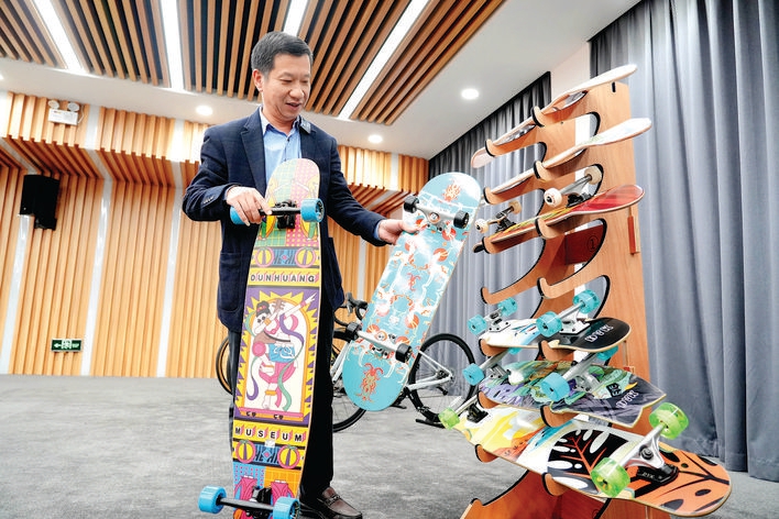 惠州市杰誠(chéng)運(yùn)動(dòng)器材有限公司負(fù)責(zé)人介紹與敦煌博物館聯(lián)名的滑板產(chǎn)品。