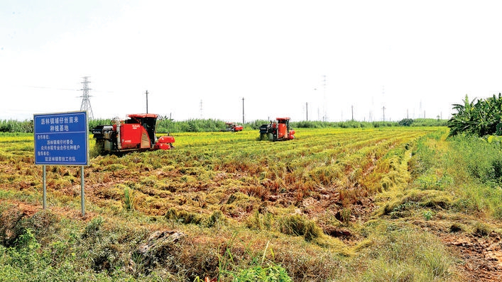 8月的嶺南暑氣正盛,在仲愷高新區(qū)瀝林鎮(zhèn)800多畝埔仔絲苗米種植基地里,沉甸甸的稻穗壓彎了枝頭,金黃的稻浪在風(fēng)中翻滾。三輛收割機(jī)轟隆隆地穿梭在廣袤的農(nóng)田里,摘穗、剝皮、秸稈粉碎一氣呵成,奏響埔仔絲苗米豐收的序曲。作為“南有絲苗”美譽(yù)的傳承者,這片銀瓶山與潼湖濕地公園之間的稻田,產(chǎn)出的米粒細(xì)長(zhǎng)、晶瑩剔透、口感清甜,蘊(yùn)藏著鄉(xiāng)村振興的希望與未來(lái)。
